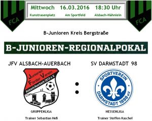 16.03.2016 Die B Jugend des JFV Alsbach Auerbach siegen nach einem dramatischen Pokalkrimi gegen den Partnerverein SV Darmstadt 98 im Elfmeterschießen mit 5:4 Toren. Nach der regulären Spielzeit und nach Verlängerung stand es 1:1. Der JFV ging zunächst verdient mit 1:0 in Führung. Erst in der letzten Minute der regulären Spielzeit gelang dem SVD98 der …